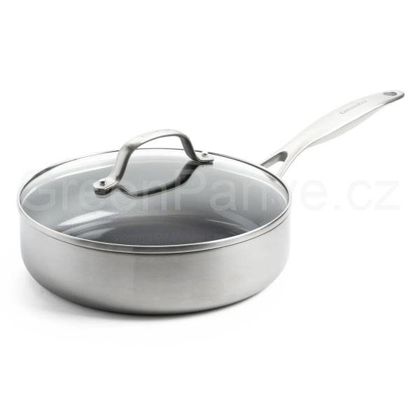 GreenPan nerezová soté pánev s nepřilnavým keramickým povrchem o průměru 24 cm s poklicí z kolekce Geneva. Vhodná na indukci, do trouby i do myčky nádobí.