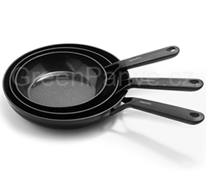 Promyšlený design, snadno stohovatelné. Design pánví je promyšlený do posledního detailu - jsou dokonale stohovatelné, takže při skladování zaberou výrazně méně místa. Vnitřek pánve, kovové uchycení rukojeti ve tvaru "V" i plastová rukojeť - vše je bez spár, ve kterých by mohlo ulpívat jídlo. Pánev je snadné udržovat čistou.
